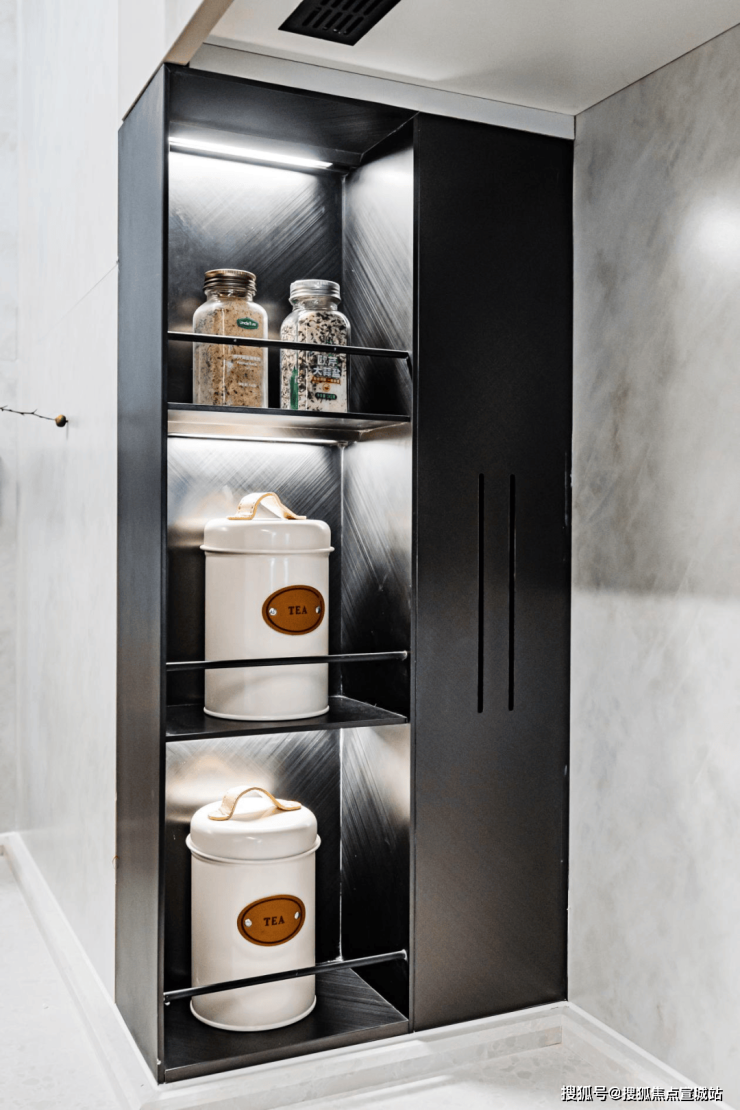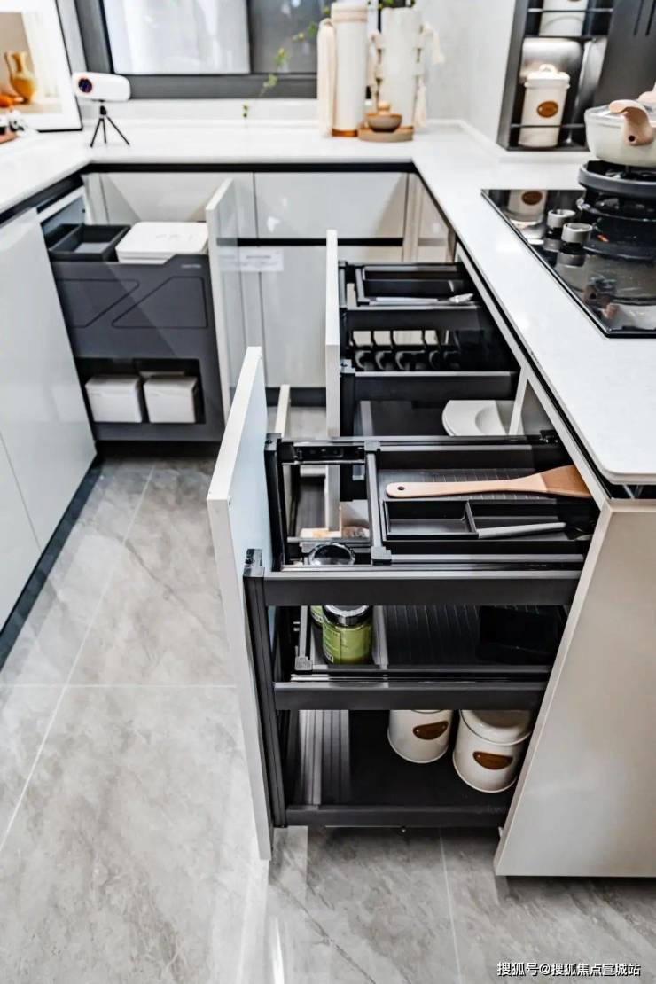 以十四重智慧空间,轻松解决收纳储物问题,入户玄关柜,收纳鞋柜与常用小物品,厨房空间定制收纳橱柜、升降拉篮、碗碟拉篮一应俱全,卫浴间台盆下收纳柜、金属包边美学镜柜、美妆冰箱等精细思考。