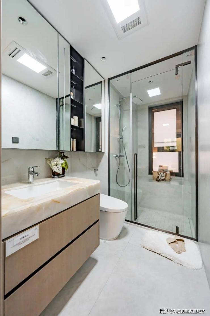 套房主卧卫浴间带天然奢石台面,诚意配置一体化金属包边美学镜柜(包含美妆冰箱/门板收纳架/轨道式置物架等,镜柜附带线控/触控镜面灯光+镜面除雾),兼具风暖浴霸、恒温顶喷花洒、双下水隐形地漏等人性化细节。另外,主客卫皆甄选知名品牌智能马桶,为现代化都会生活赋予更多品质享受。